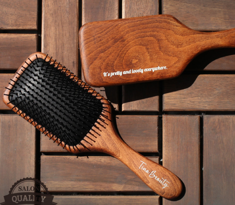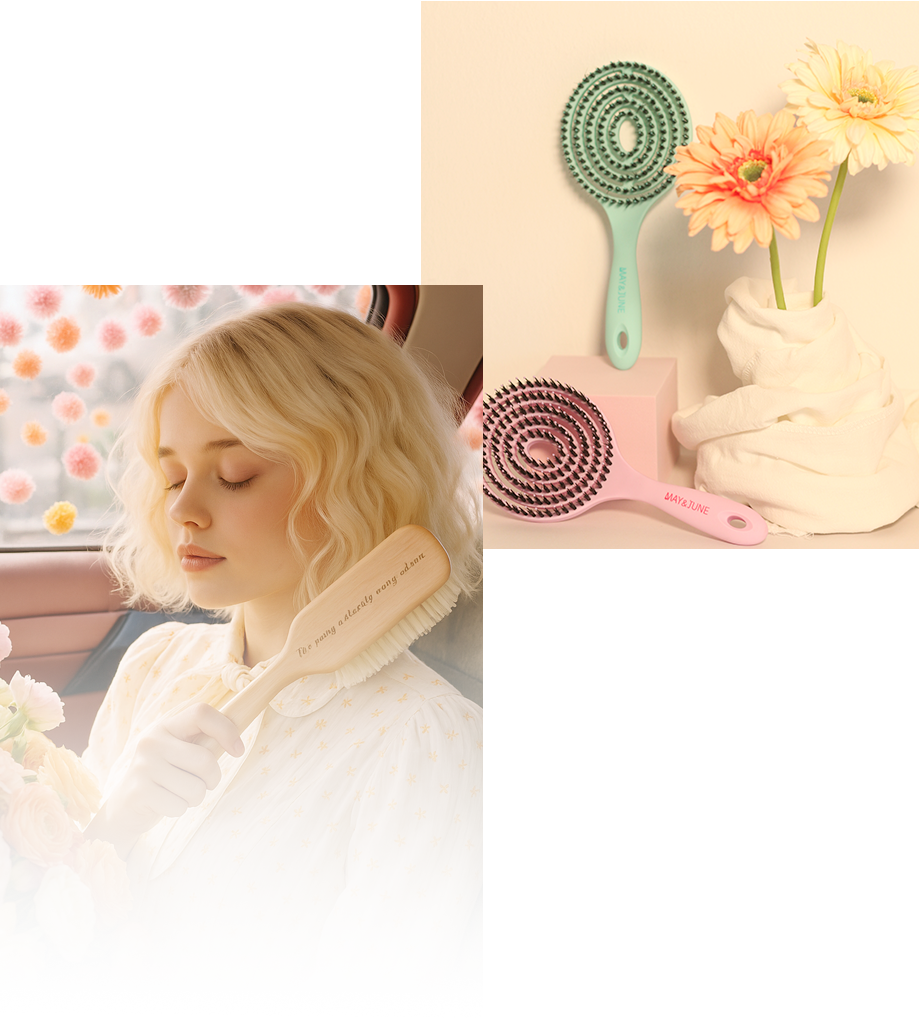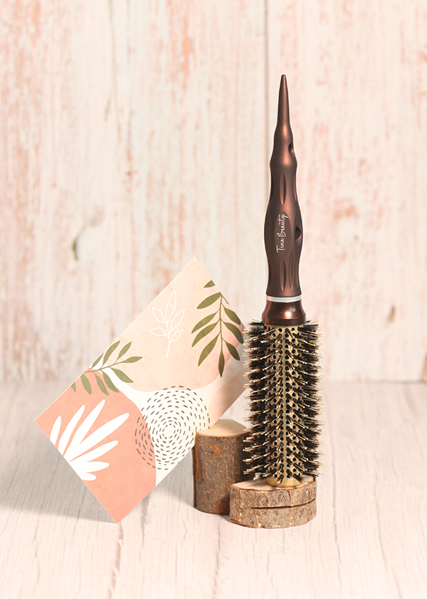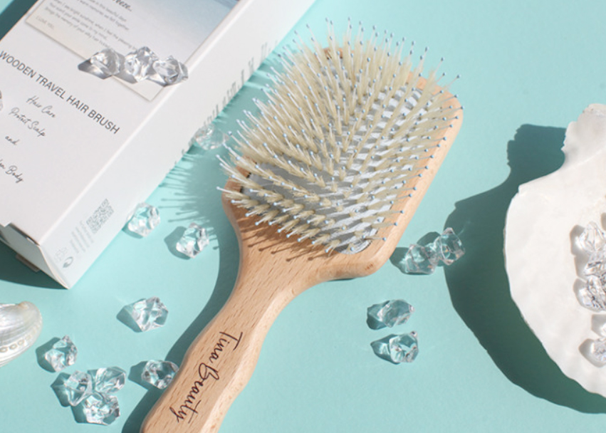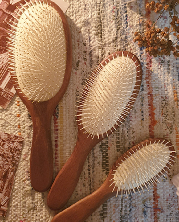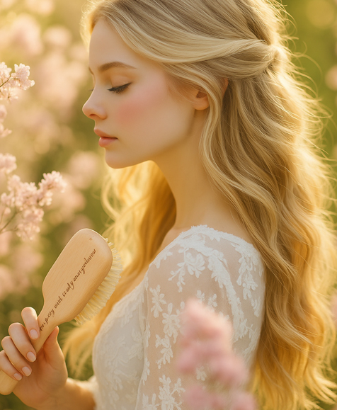 自然な仕上がりを叶えるプレミアムウッドブラシ 天然素材で作られたブラシが頭皮をやさしくマッサージし、髪を自然に整えます。